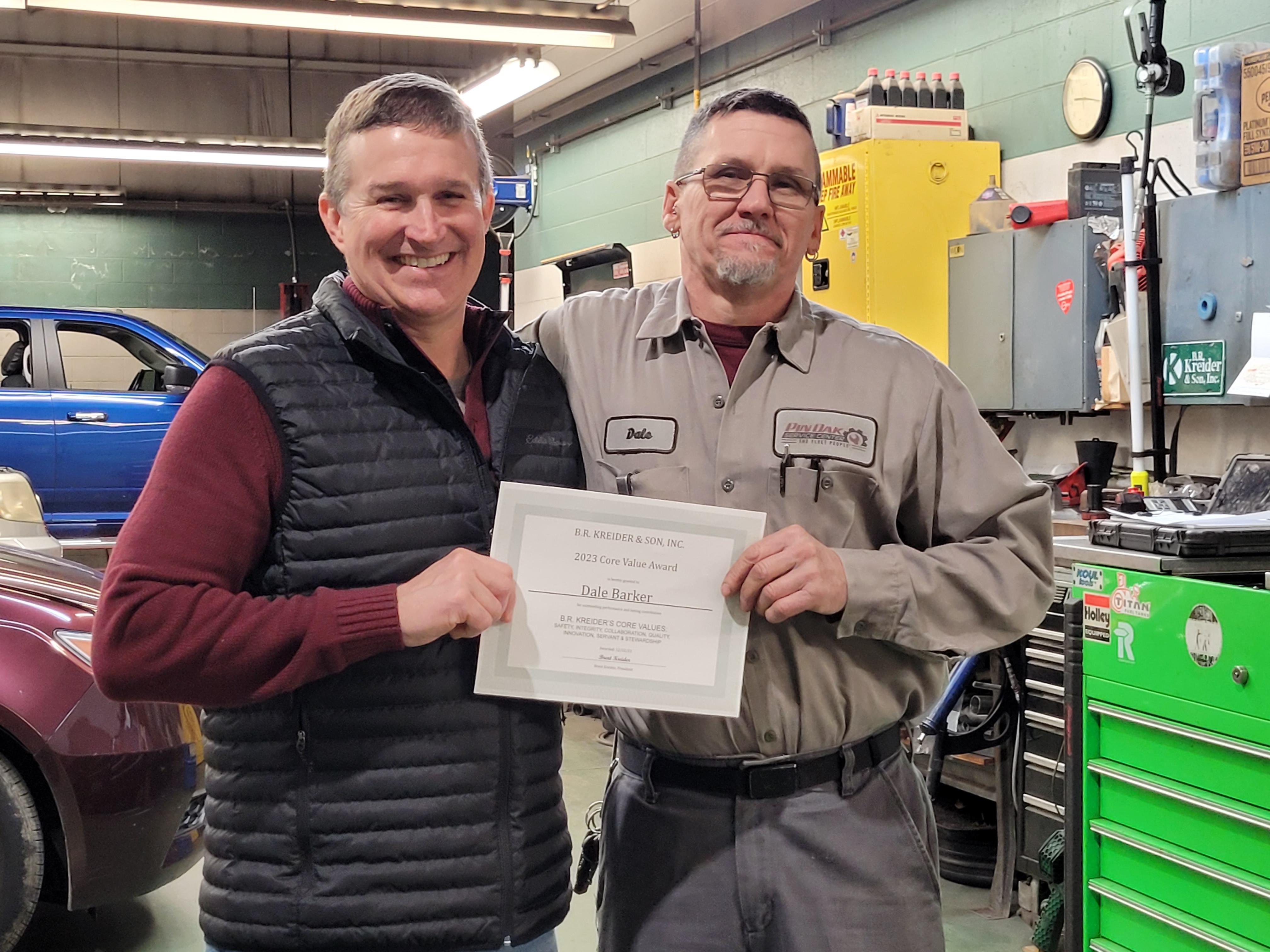 Dale Barker, Lead Technician of Pin Oak Service Center, with the 2023 B.R. Kreider Core Value Award Presented by Brent Kreider